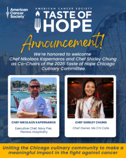 On November 5, 2026, chefs from across the city will gather in the Aon Grand Ballroom at Navy Pier to serve 1,000 guests at Taste of Hope Chicago, benefiting the American Cancer Society.